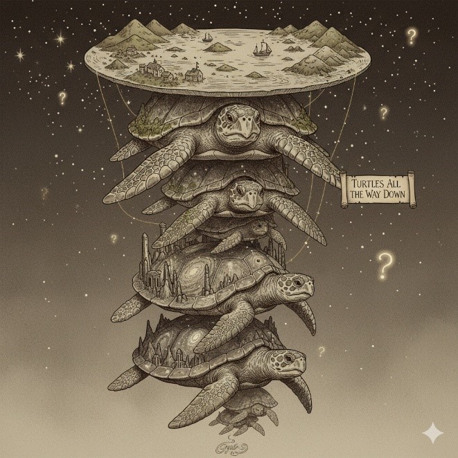 I know from the book that Gawdat has had some Buddhist teachings that he really wants to believe. He also wants to believe that his son will have an afterlife and that they will meet in it. His hopes are dependent upon believing this argument, but this belief in a Grand Designer does lead to the issue of infinite regress, best represented by the famous “it’s turtles all the way down” comment.