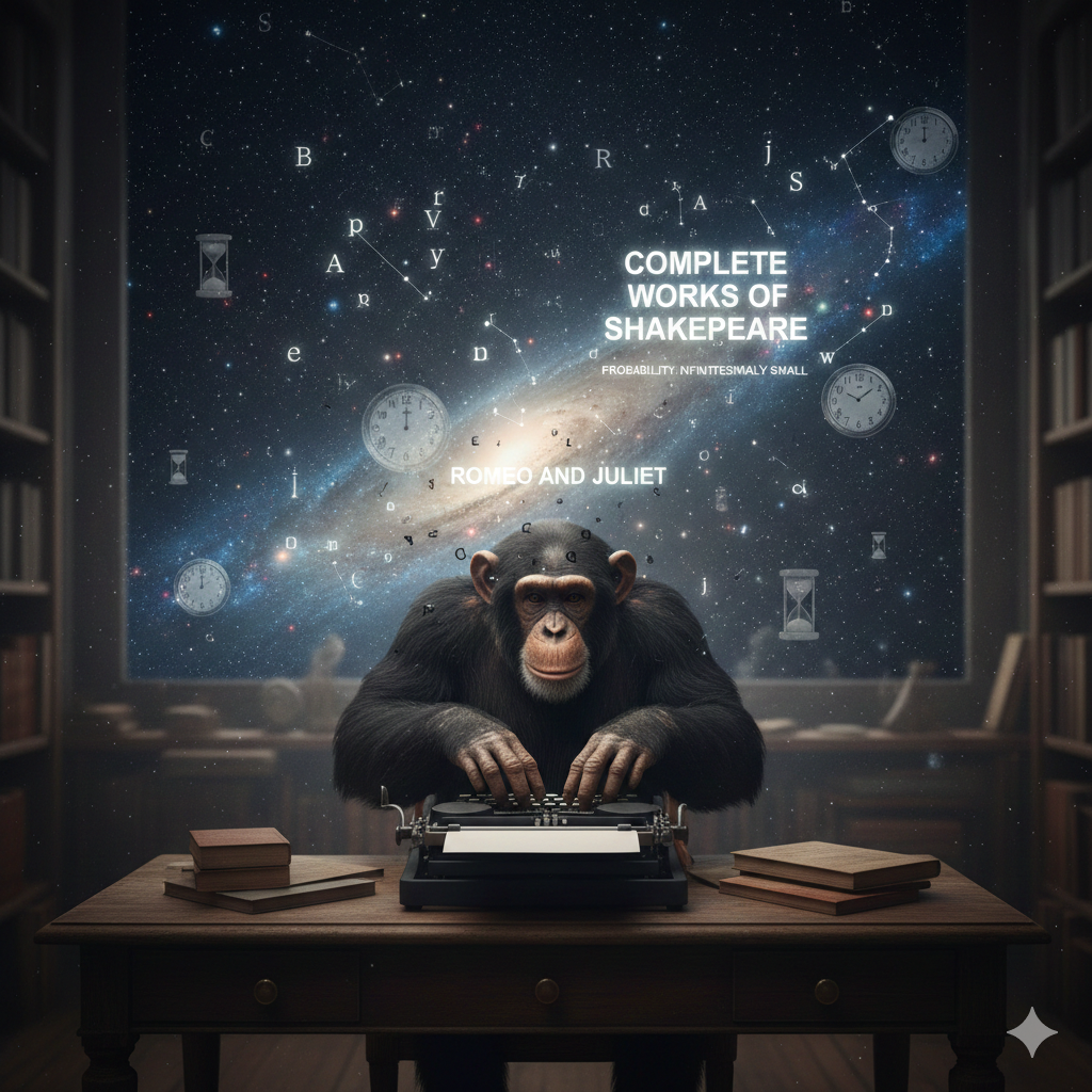 There is a theorem that states that a monkey hitting keys independently and at random on a keyboard for an infinite amount of time will type any given text, including the complete works of William Shakespeare. While this theorem has a mathematical proof, Gawdat notes that the probability of this occurring is infinitesimally small, since it would take much longer than the time the entire universe has existed to randomly type the right sequence, much less add the proper spaces and punctuation. Random results are possible, but only using large time frames.